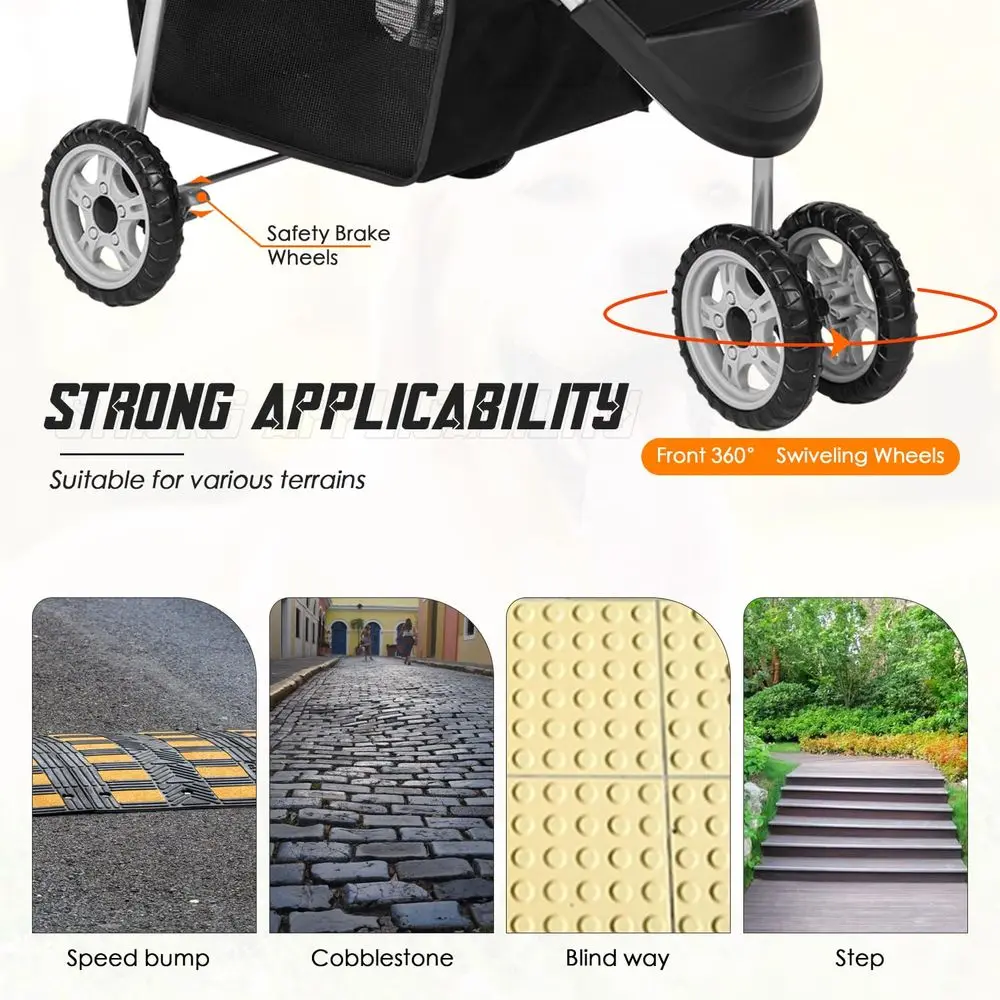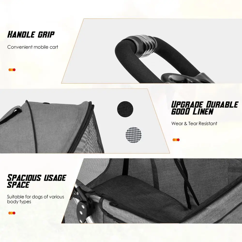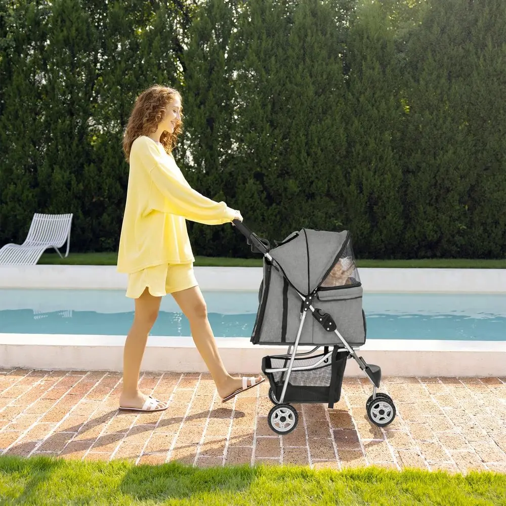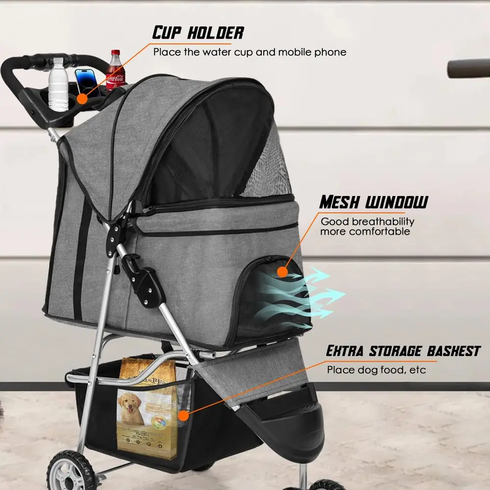 3 Wheels Pet Stroller for Dog and Cat with Storage Basket & Cup Holder, Portable Lightweight Travel Carrier, Grey