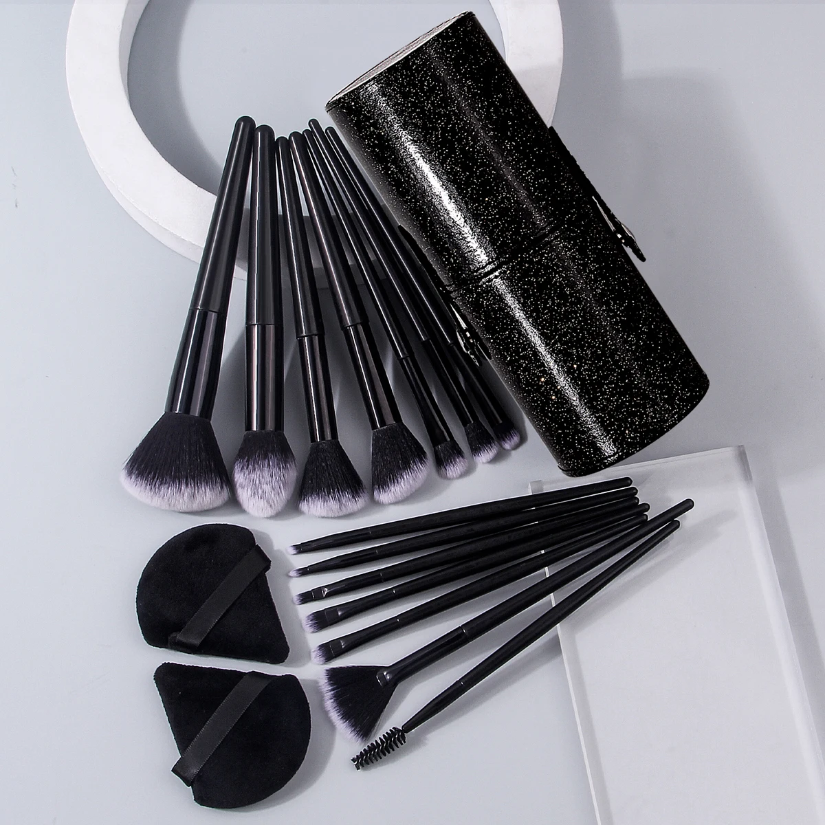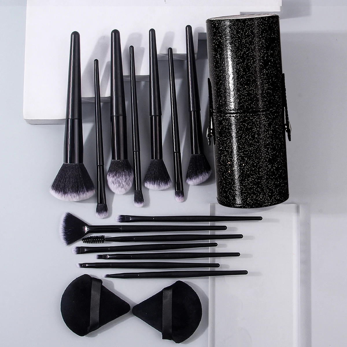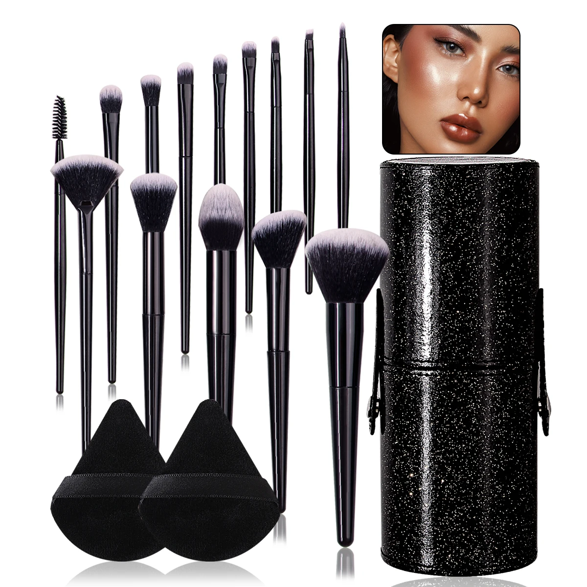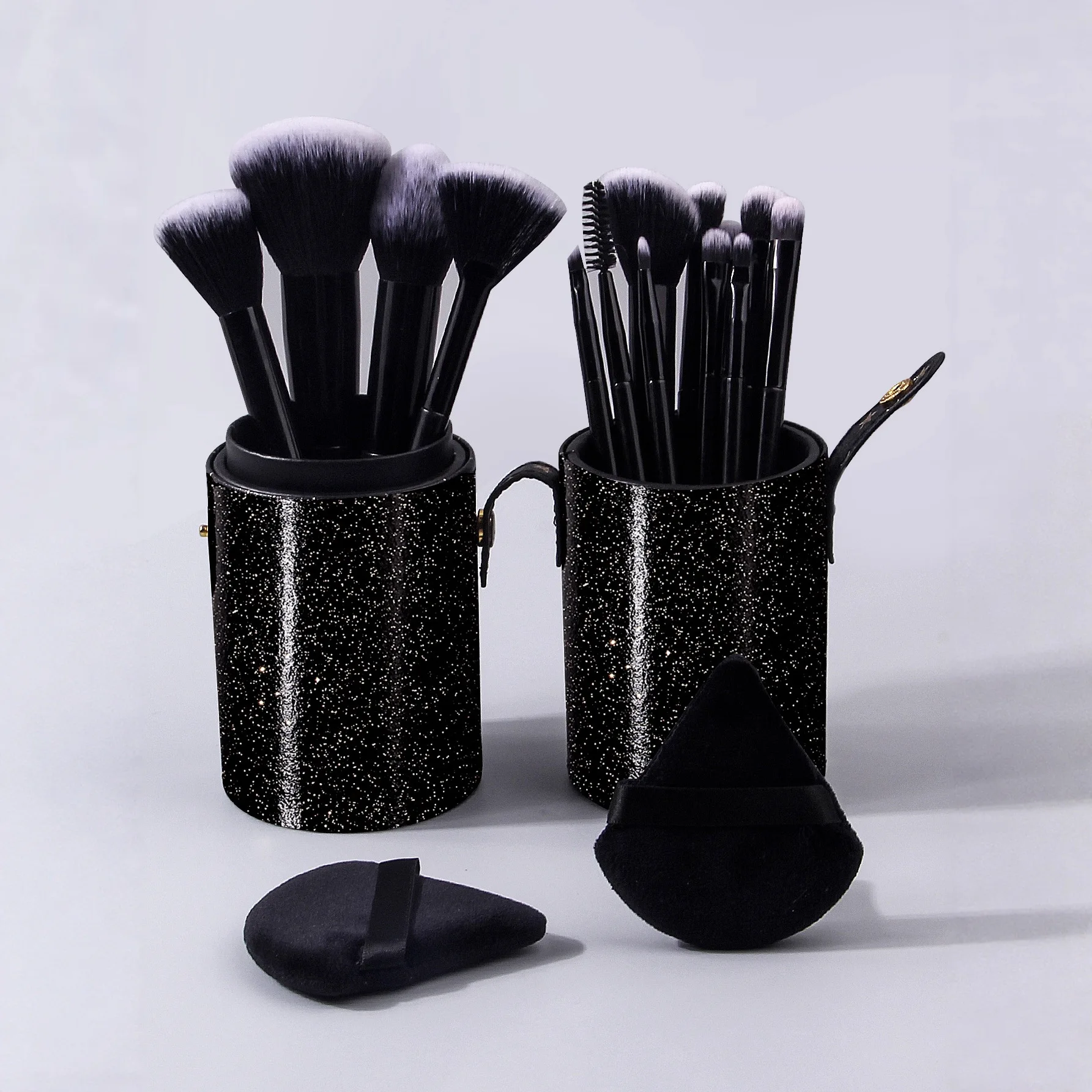 A set of 14 high-quality multi-purpose facial makeup brushes +2 soft triangular powder puffs +1 portable storage bucket