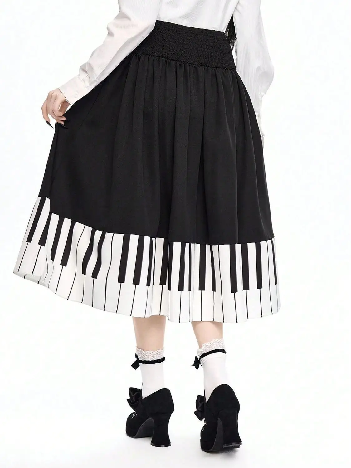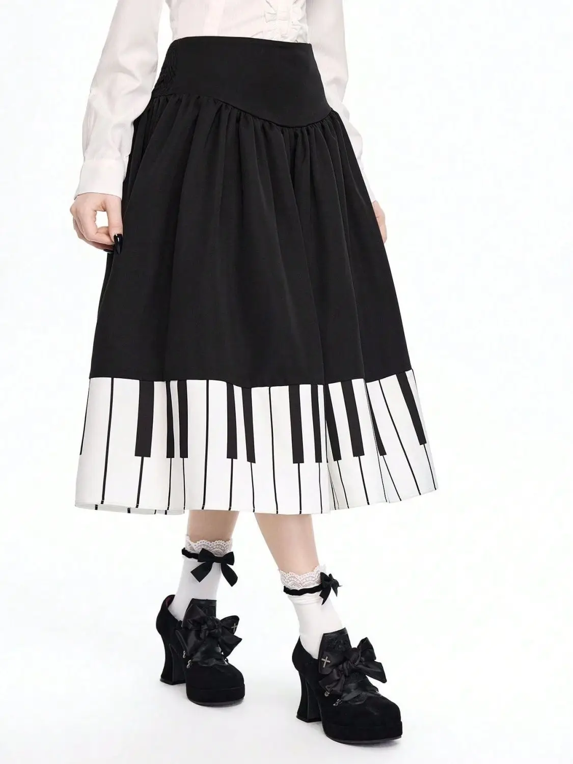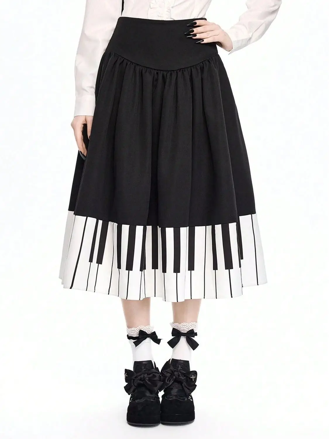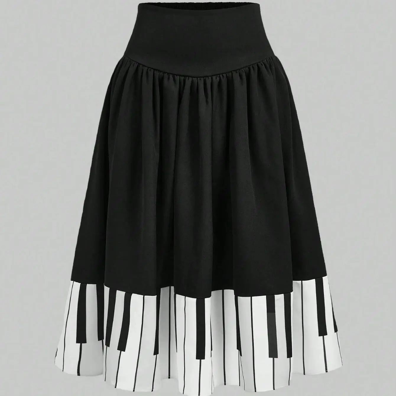 American Retro Sweet Spicy Black White Piano Pleated Skirt High Waist Slim Fit A Line Midi Skirt Vintage Design Skirt for Women