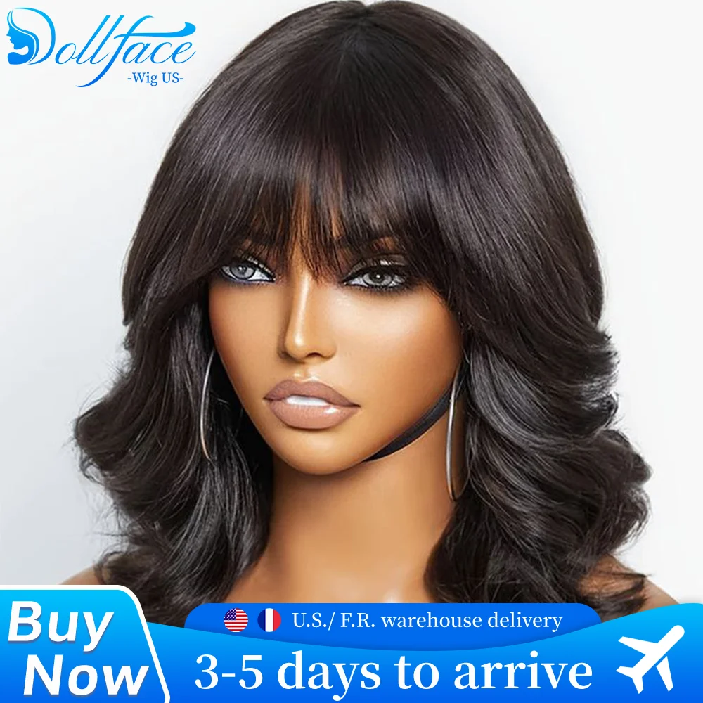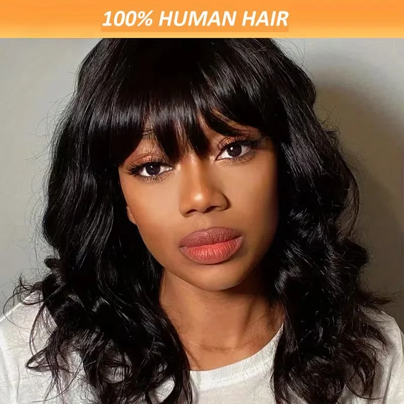 Body Wave Bob Wig With Bangs Short Full Machine Made Human Hair Wigs 220% Density Loose Body Wave Brazilian Natural Black Color