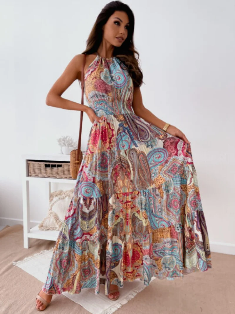 Fashionable and sexy bohemian-style printed backless suspender long dress for women