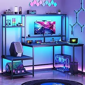 Gaming Desk with LED Lights & Outlets,55″ L Shaped Computer Desk with Shelves & Storage Hutch,Reversible Corner Gaming Table wit