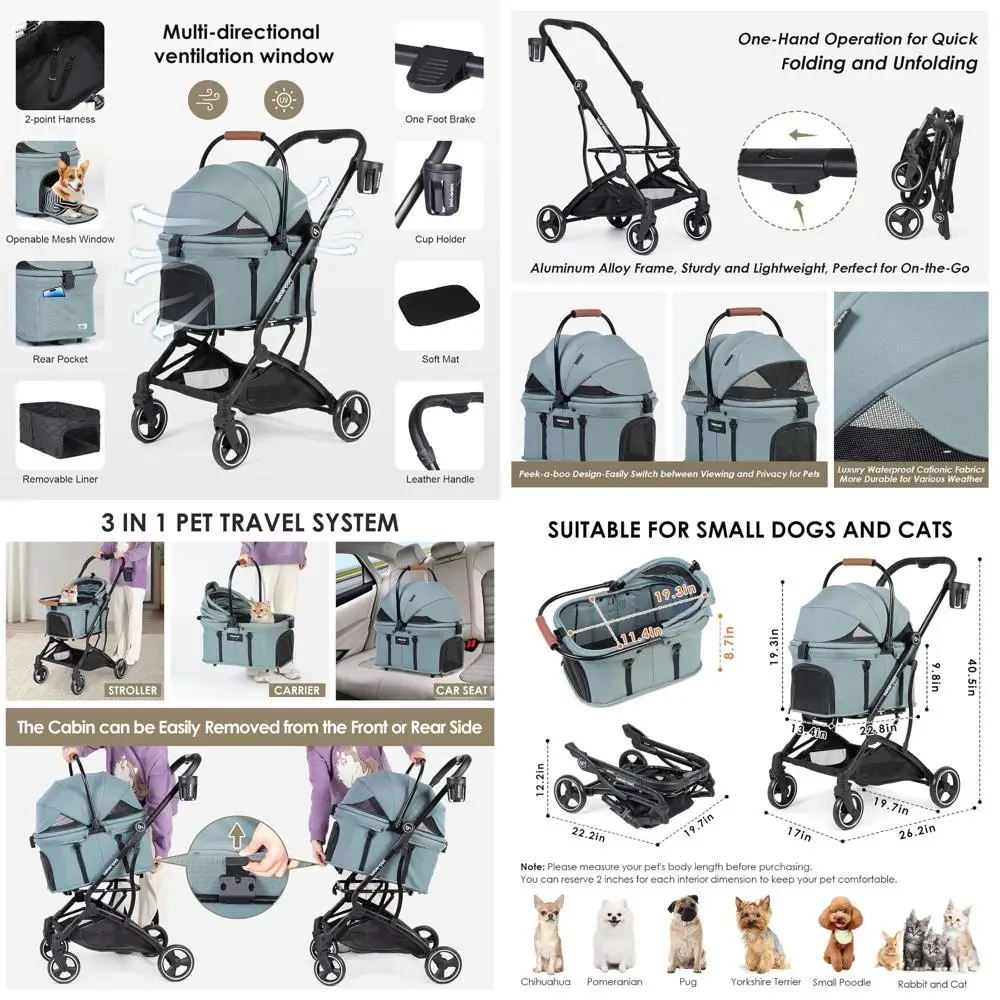 Green 3-in-1 Pet Stroller for Dogs & Cats with Detachable Carrier, 4 Wheels, Pad, Canopy, and Cup Holder