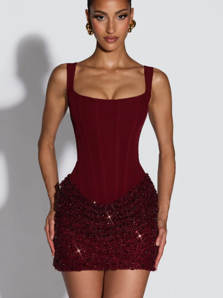 Sexy Sequin Patchwork Sling Mini Dress Women Chic Off-shoulder Backless Waist Cinching Slim Short Dresses Lady Club Party Gowns