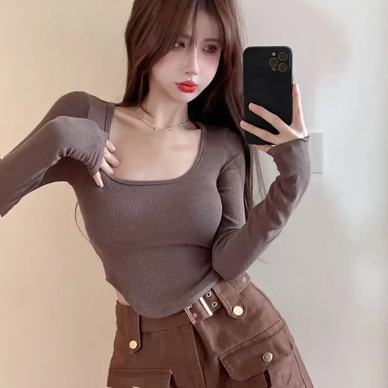 Sexy Slimming Inner Wear Long Sleeve T-shirt Women’s Spring Cropped Round Neck Tops Pure Desire Irregular Shape