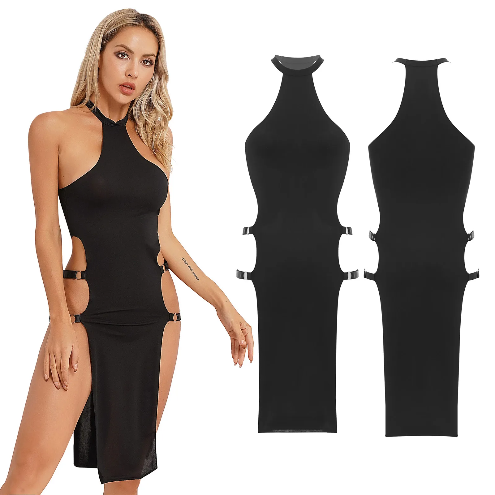 Sleeveless Womens Sides Split Bodycon Dress Sexy Pole Dance Costume Summer Black Adjustable Strappy High Cut Dresses Party Club