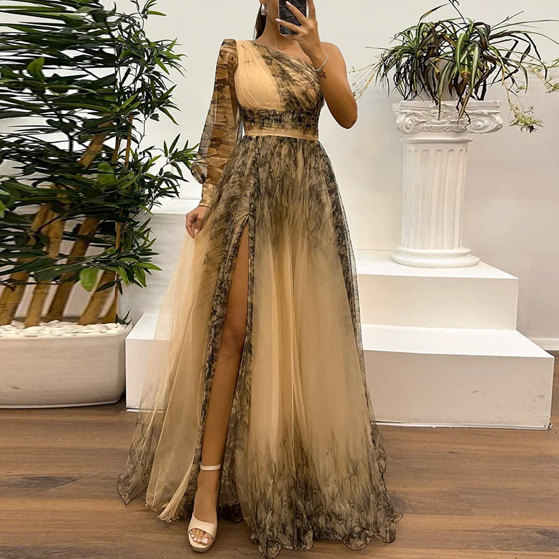 Vintage Pattern Printed High Waist Long Dress Sexy Asymmetric Mesh Evening Dress New One Shoulder Sleeve Pleats Bridesmaid Dress
