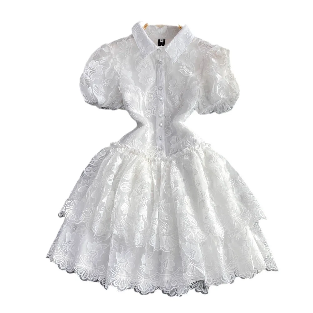 Women Vintage Lace Gown Dress Turn Down Collar Puff Sleeve Mini Dresses Single Breasted Spliced Elegant Vestidos Summer